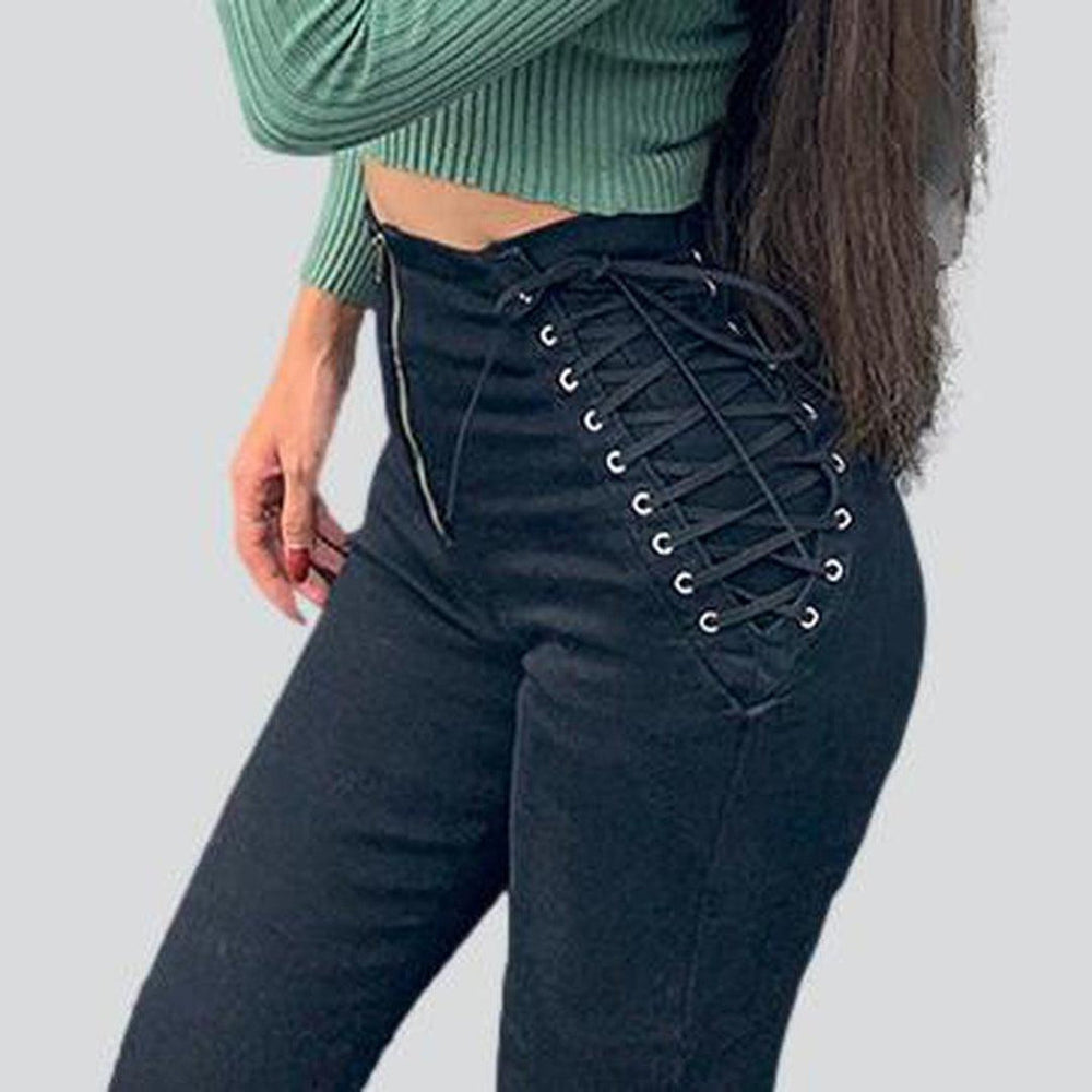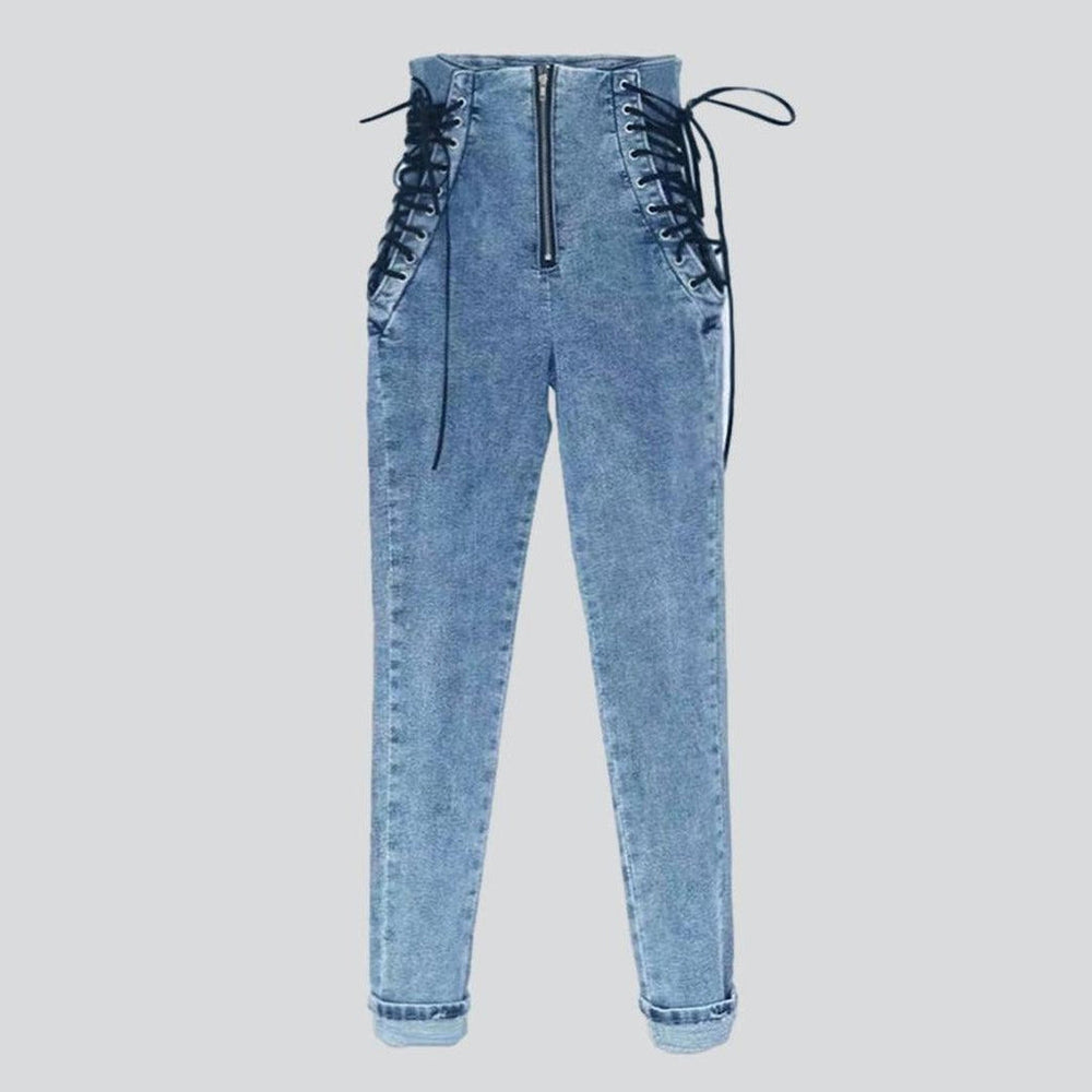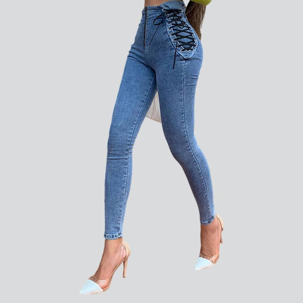 Make a statement this season with our 2023 Autumn Collection of informal-style. stonewashed. skinny jeans with drawstrings. zipper closure and a tall-waist cut. Crafted with luxurious stretchy denim fabric. these jeans are the perfect blend of comfort and trend.