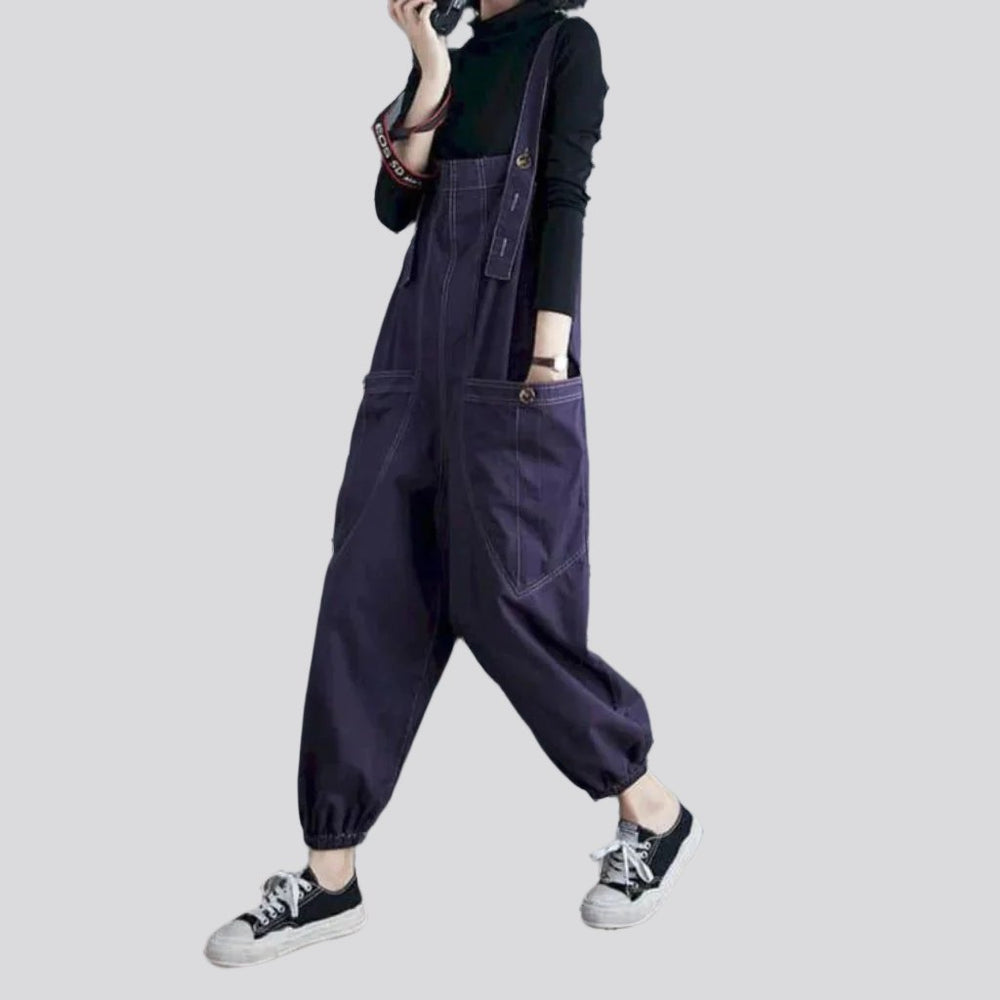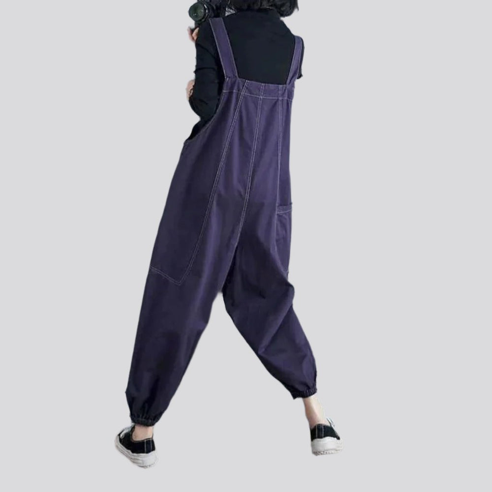 Become the center of attention with this eye-catching Y2K Color Denim Jumpsuit from the 2023 Spring Collection! With its unique style. baggy fit. and dark purple hue. this jumpsuit is sure to make a statement and turn heads. Plus. the suspenders closure adds an extra touch of style for the perfect finishing look. Wear it with your favorite accessories and show off your fashionista side!
