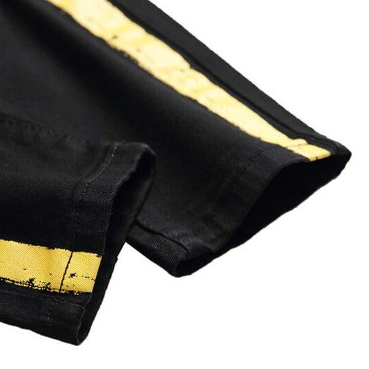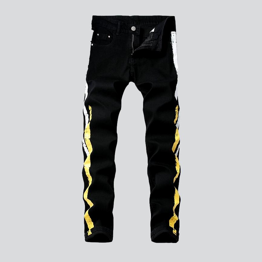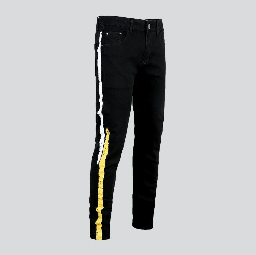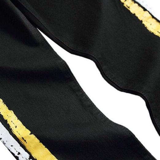 Make a bold statement with this 2023 Autumn-Winter Collection Yellow & White Bands Men's Jeans! Whether you want to rock a classic denim look or embrace the eclectic Y2k style. these mid-waist jeans feature a special painted design and unique patched that make it a show-stopper. They are also designed with a zipper & button closure. stretchy fabric for comfort. and a skinny cut to flatter your figure.