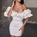 The oversized ruffles to the shoulders add drama yet it sits sexily in an off-shoulder cut.