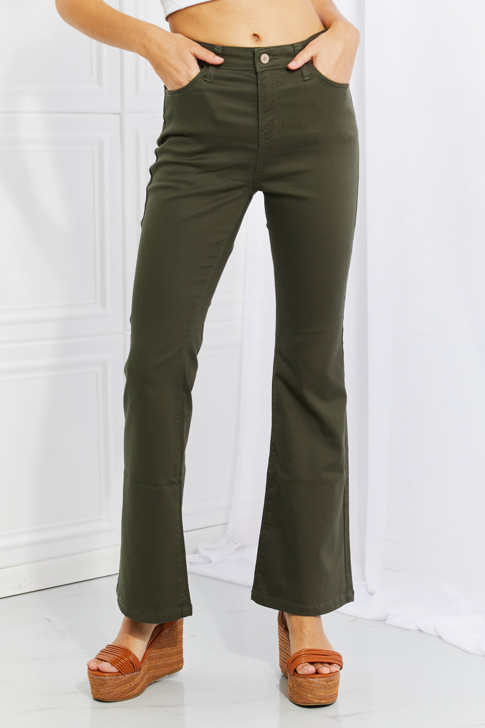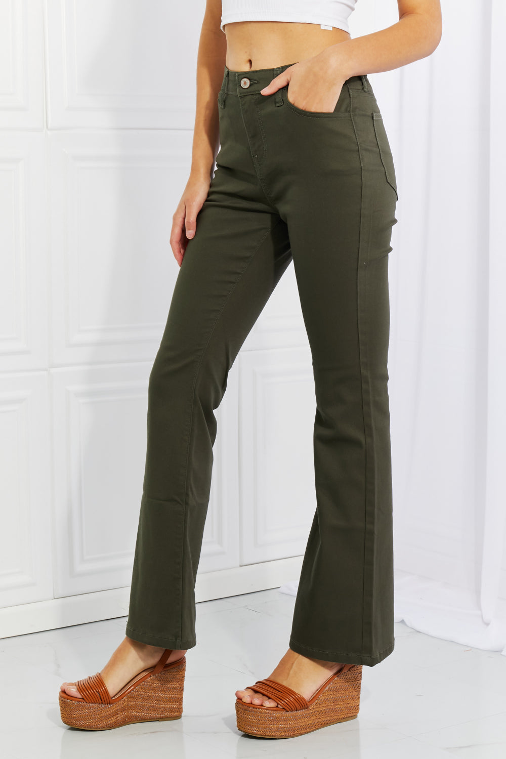 The modern feel of these bootcuts provide the perfect start to a great outfit! A high rise and a bit of stretch make sure you stay comfy throughout the day and the versatile silhouette transitions seamlessly from day to night.