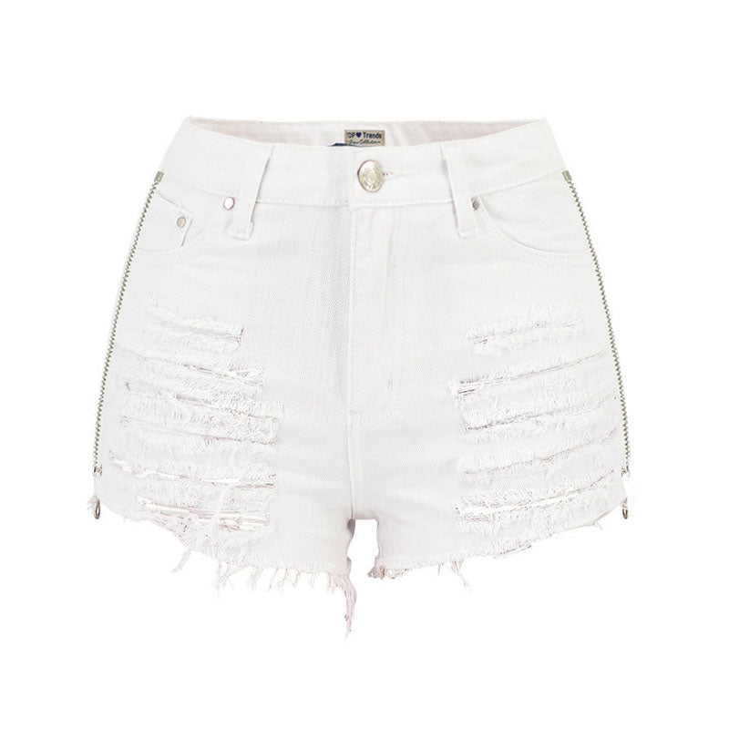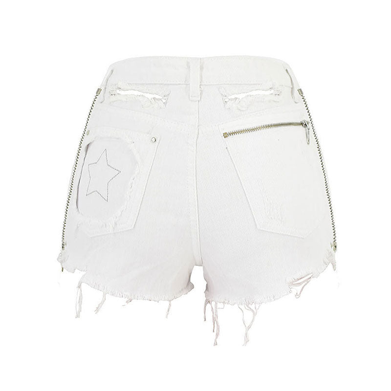 This little white denim is funny cuz you can style it by yourself. Made of blend denim and polyester in solid color. stand out in functional zips at sides and the rear. featuring a high rise waistband trimmed with belt loops. a button closure along with a concealed zip fastening to the front. and unique five pockets with an embroidered star. and asymmetrical cuffs accented with shredded cutouts and frayed hems. Find more trendy women's denim shorts or clothing in our boutique. and wear it with anything-depending on the look you want.