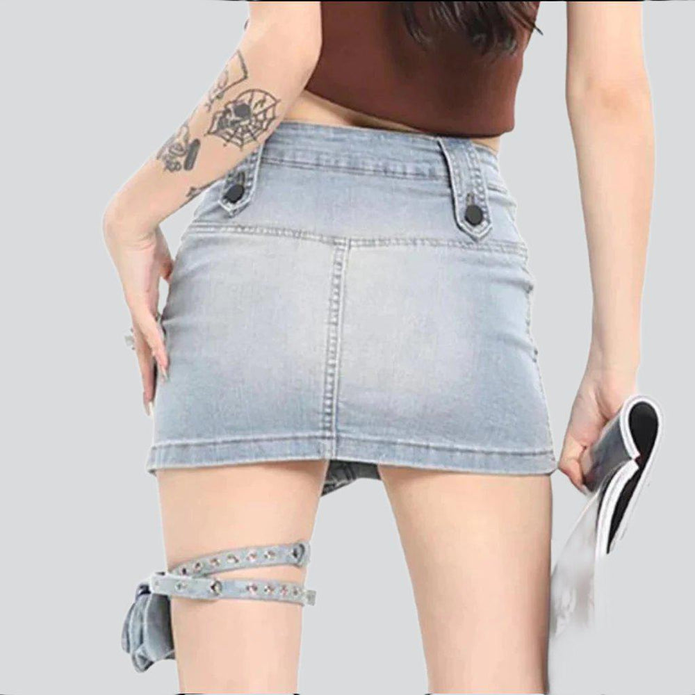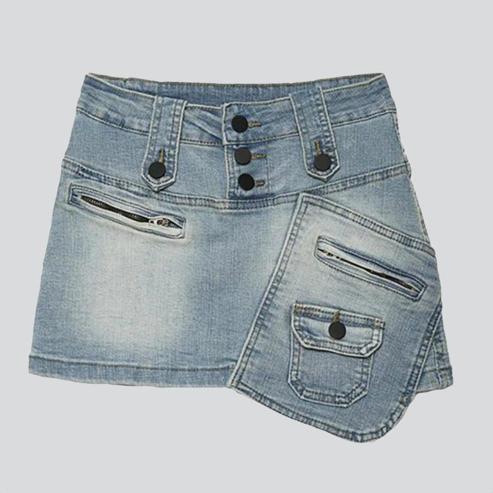 Introducing the 2023 Summer Collection: the urbane denim skirt with zipper pocket and street style. This mid-rise mini skirt features a light wash and buttons closure a established piece that's perfect for any occasion!